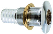 Available in plain or chrome plated bronze, these fittings have a hose barb connection and are recommended for use above the waterline only. The flange is machined to fit the hull tightly and grooved to retain bedding compound. Minimum hull thickness 3/8".