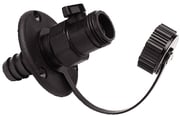 Made of injection molded plastic. Fitting is 2-1/4" in diameter and mounts in 1-1/4" diameter hole with three countersunk screws. Barbed hose fitting connects to 3/4" I.D. hose.